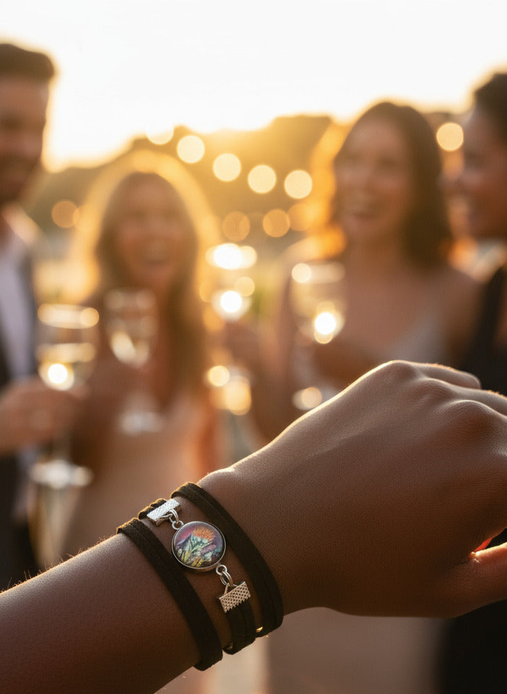 A comfortable and unique wrap around bracelet with an adjustable length strap. Solid domed glass charm in an antique bronze frame. The artwork used in the design is an original watercolour painting